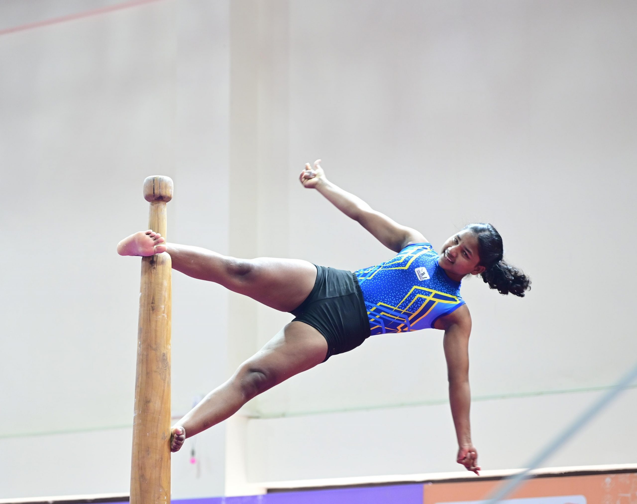 Pole and rope Mallakhamb practice for strength and flexibility.